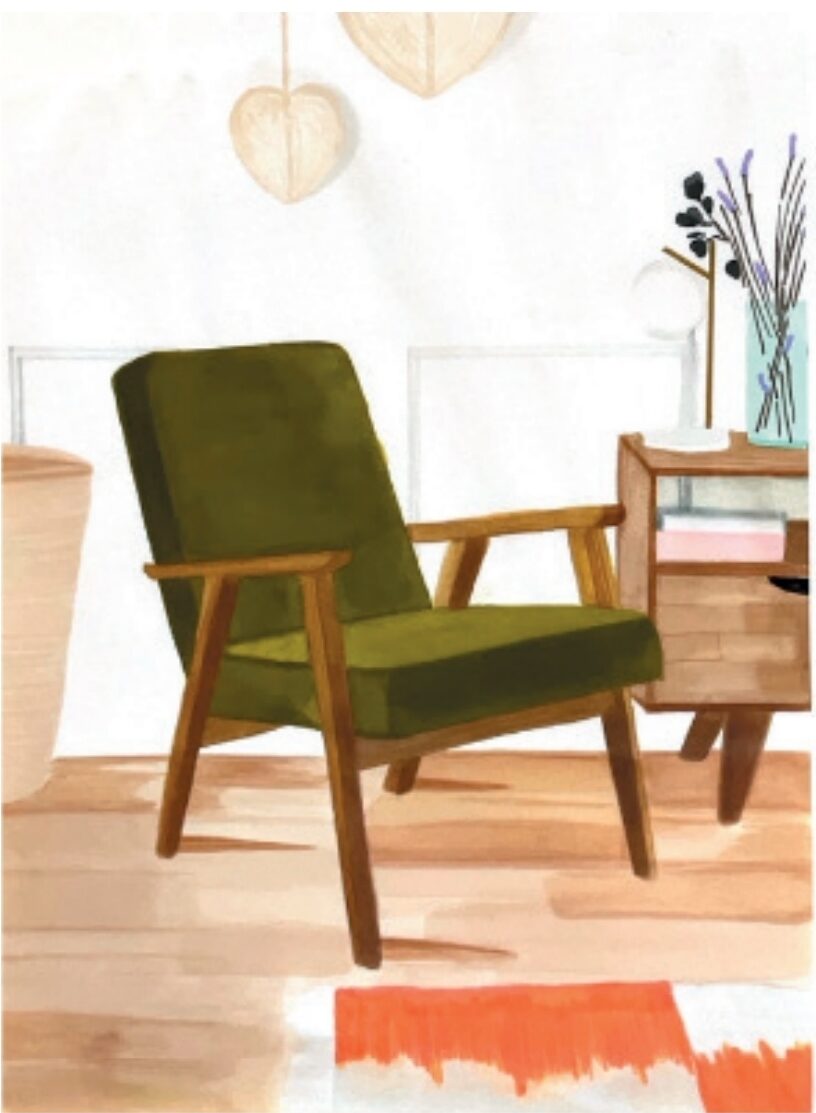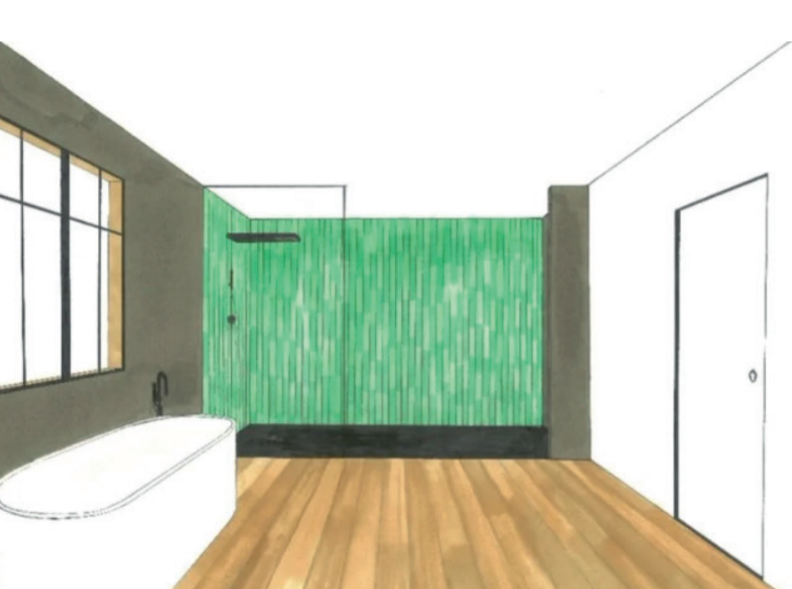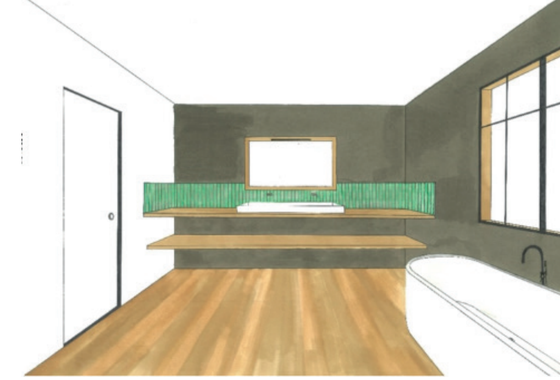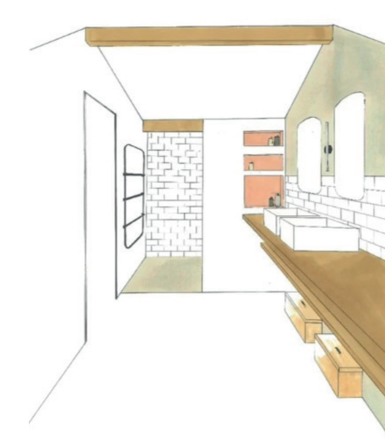 Mise en perspective d’une salle d’eau et d’une salle de bain à l’aide de feutres à alcool.