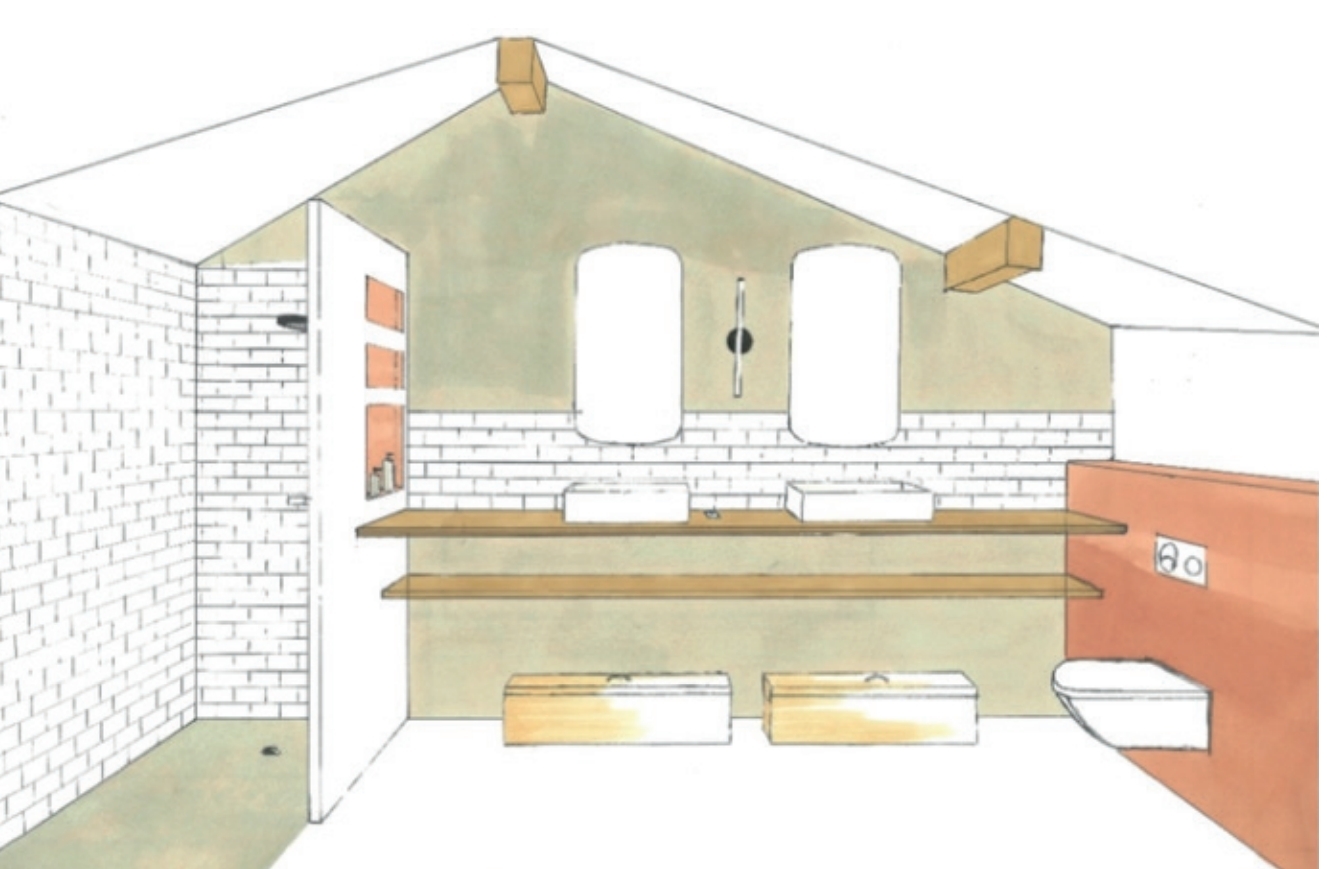 Pour la première salle de bain, une niche a été intégrée sur la paroi séparant la douche, selon la demande des clients. Le mur beige sera recouvert de béton ciré, avec une peinture terracotta et un plan de vasque en bois, en harmonie avec les poutres apparentes.